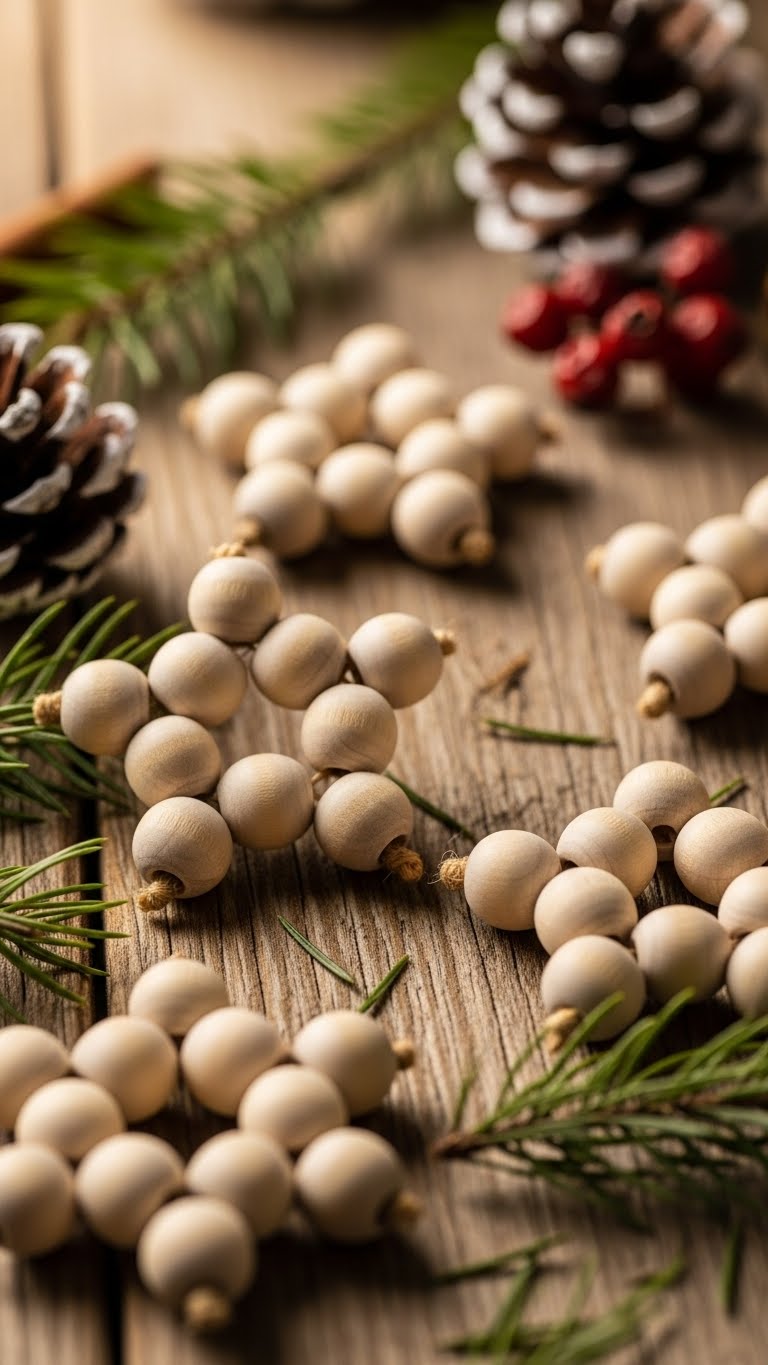 String wooden beads into star forms. Use a needle and thread for this. Buy beads from a thrift store. Arrange on tables as decor. This project is cheap and quick. Under $5 for supplies. Make several in one go. They add a hygge feel. No painting needed. Just basic stringing. Place with candles for effect. Store in a box for next time. Kids can help thread them. See your table glow up.