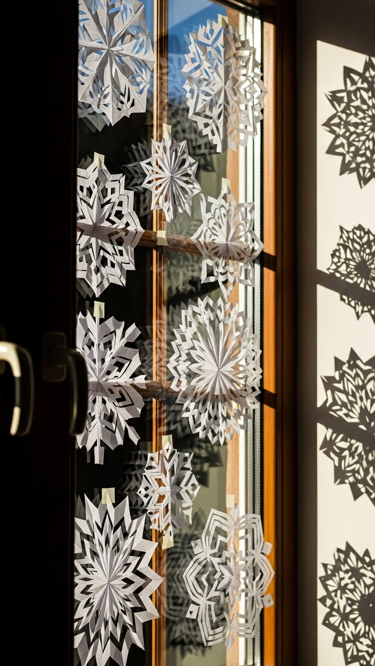 Fold paper into snowflakes. Cut simple shapes. Stick on windows. Use printer paper at home. This is effortless for starters. Costs nothing extra. Do it in 5 minutes. They catch the light beautifully. Remove when done. Perfect for brightening rooms.