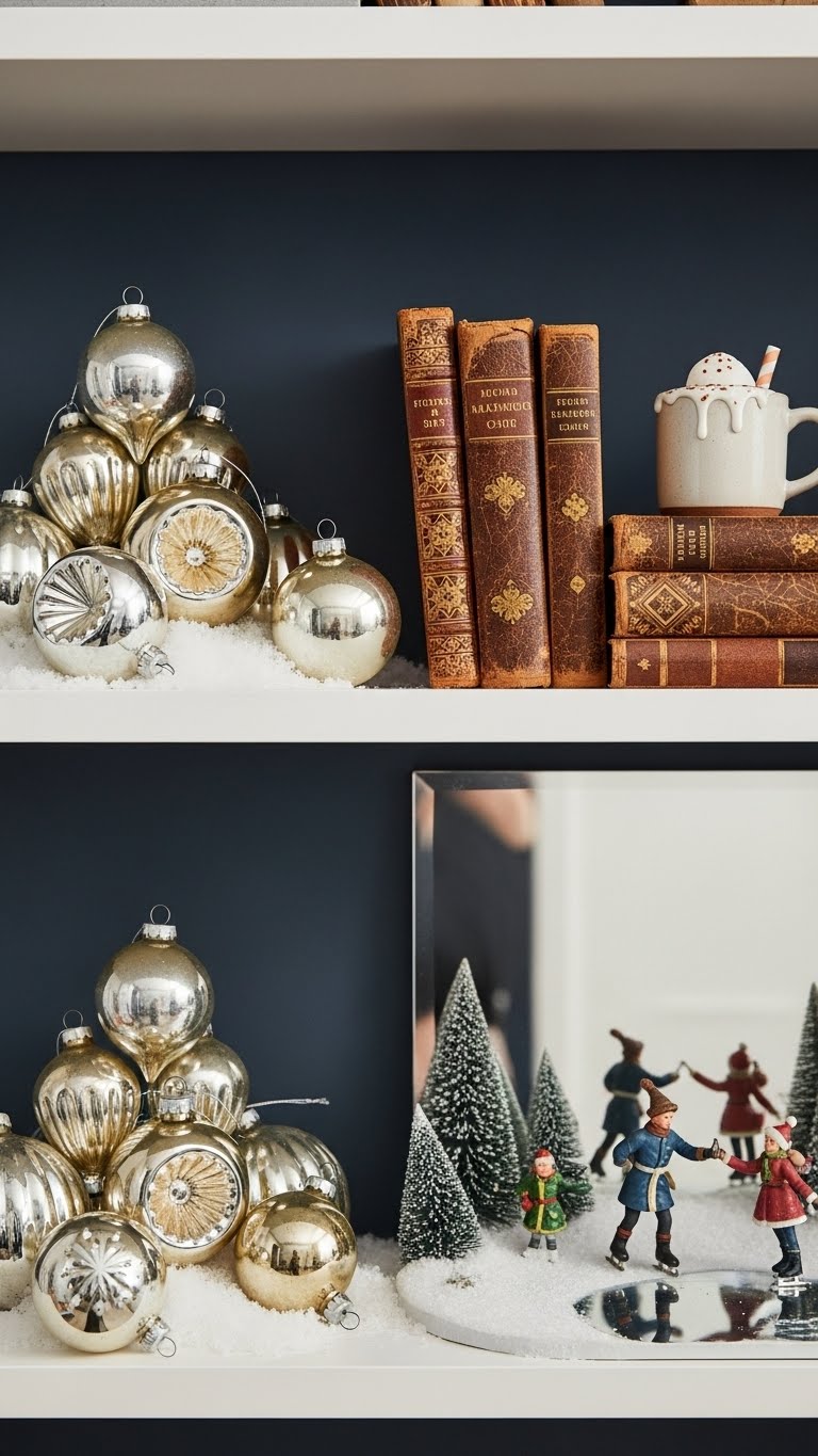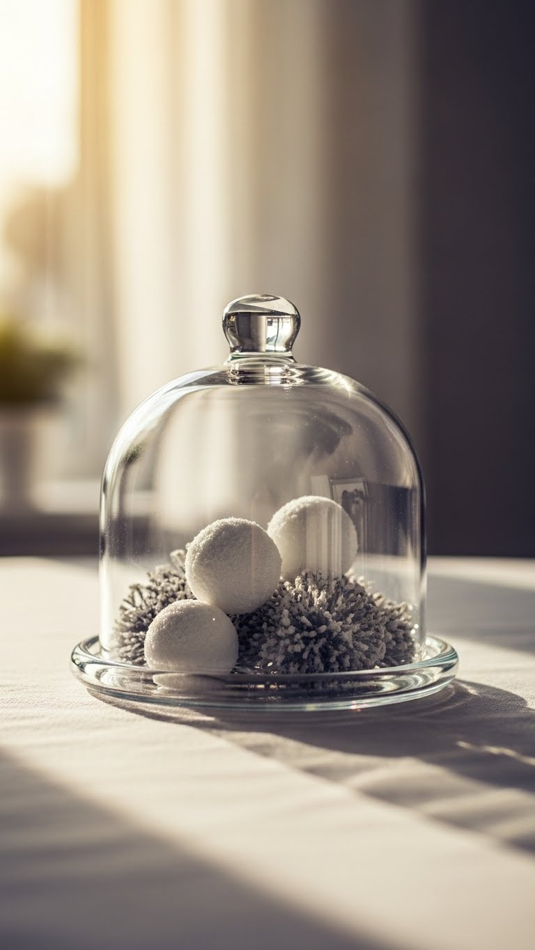 Fill a cloche with winter items. Like fake snowballs inside. Place on your table. Use a jar if needed. This creates a focal point. Free if you improvise. Set up quickly. It looks polished. Change scenes as you like.