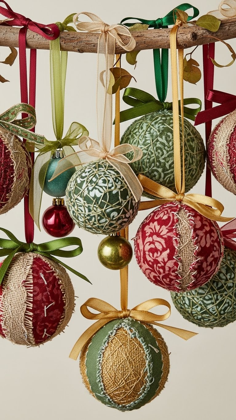 Wrap old balls in fabric scraps. Tie with ribbons. Hang on a branch. Use what you have stored. This revives old decor. Under $1 for materials. Do it in minutes. They add color easily. Store for reuse.