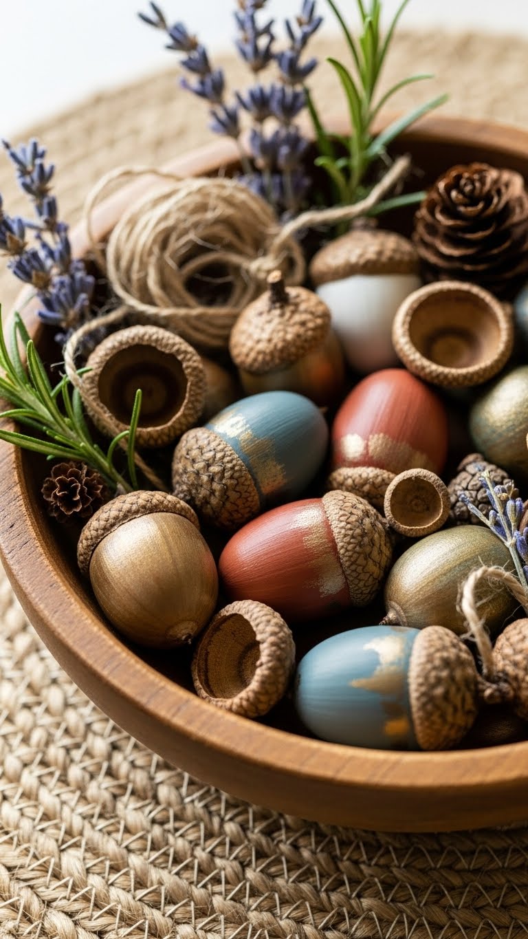 Fill bowls with painted items. Like acorns or beads. Place around your home. Use free finds. This is easy and cheap. Set up fast. Adds texture nicely.