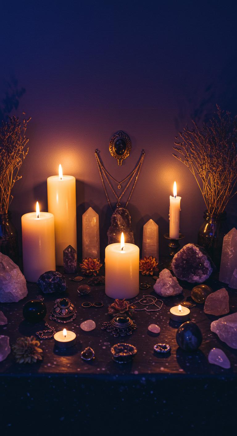 - Mood lighting: Use candles of varying heights and sizes. Consider colors that align with your intentions—black for protection or white for clarity.