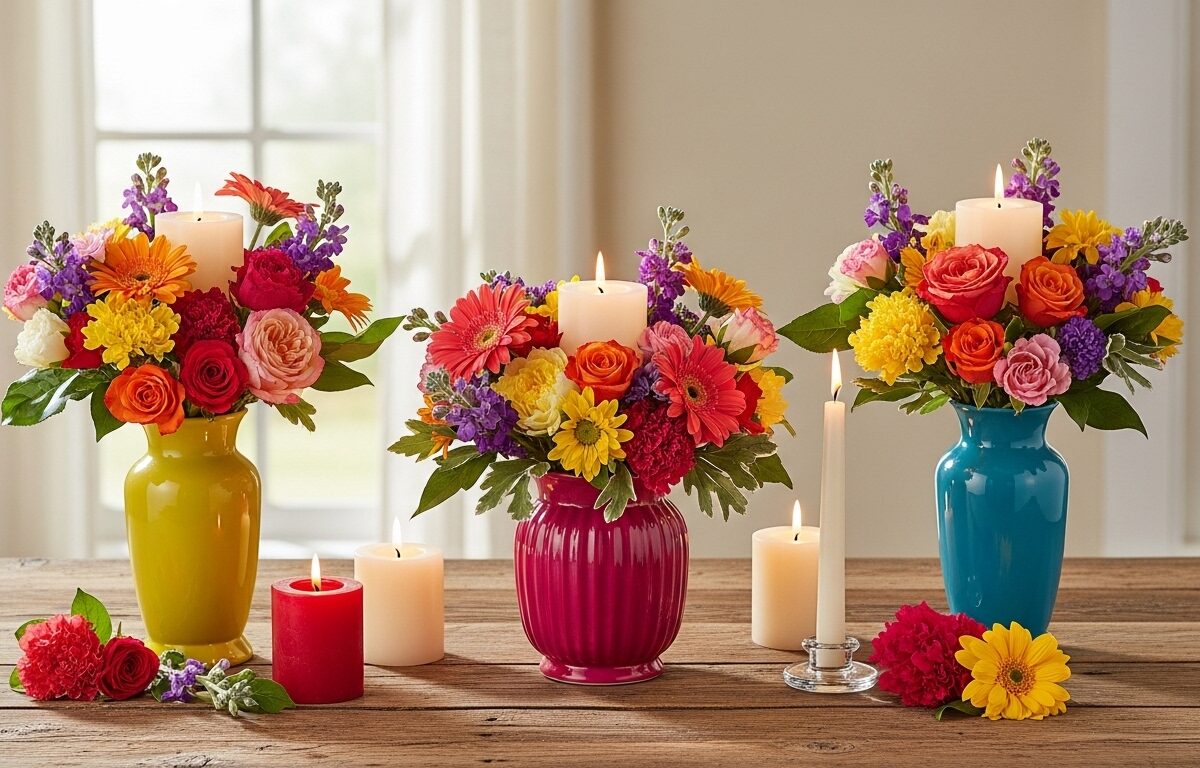 A vase with blooms and a candle on top – cozy and romantic. I used it at my book club potluck; everyone wanted the deets. Pro tip: mix scents for ambiance.