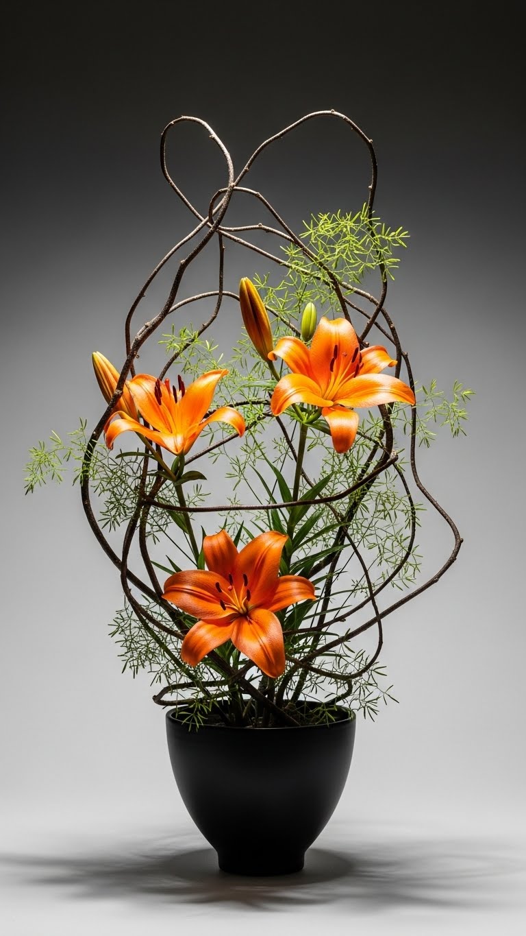 Pick up a few long stems like lilies or dahlias. Twist them gently to create curves and shapes. Place in a tall vase to highlight the form. Leave some space between flowers for a modern twist. This adds movement to your table. For a budget-friendly tip, use branches from outside instead of expensive blooms.
