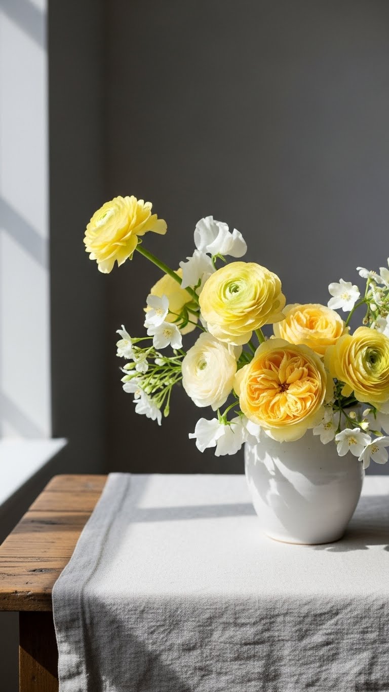 Select lemon-toned flowers and white ranunculus. Cut stems evenly and group by color. Arrange in a low bowl for a fresh display. Pair with simple greenery for balance. This combo suits indoor or outdoor spots. Save money by mixing in affordable fillers like baby’s breath.