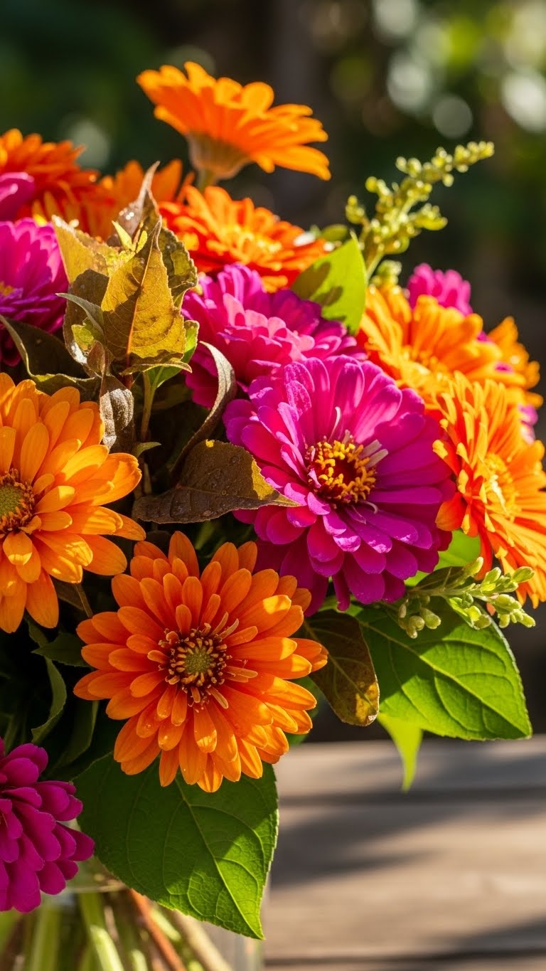 Pick orange and fuchsia blooms from the store. Add greens for contrast. Arrange in a wide container. This mix brings energy to tables. Opt for sales on colorful flowers to save.