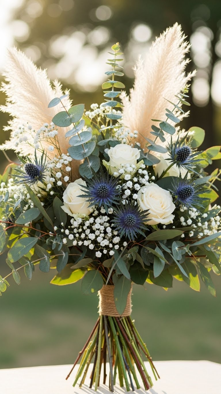 Gather eucalyptus and thistle. Bundle tightly. This gives boho vibes. Forage for free textures.