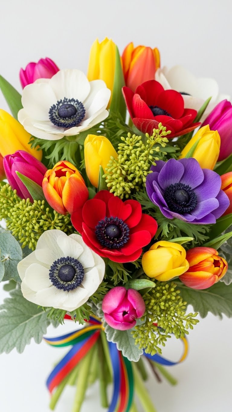 Combine anemones and tulips. Mix colors freely. This breaks rules funly. Shop sales for vibrancy.