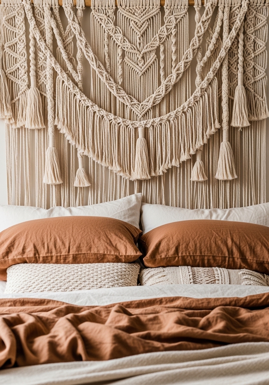 I found a large macramé piece at a local market and paired it with linen pillows and a cream throw. It softens the wall and adds tactile contrast. Use macramé hanging planters nearby for balance. Mistake: hanging too low — aim 6-8 inches above headboard.