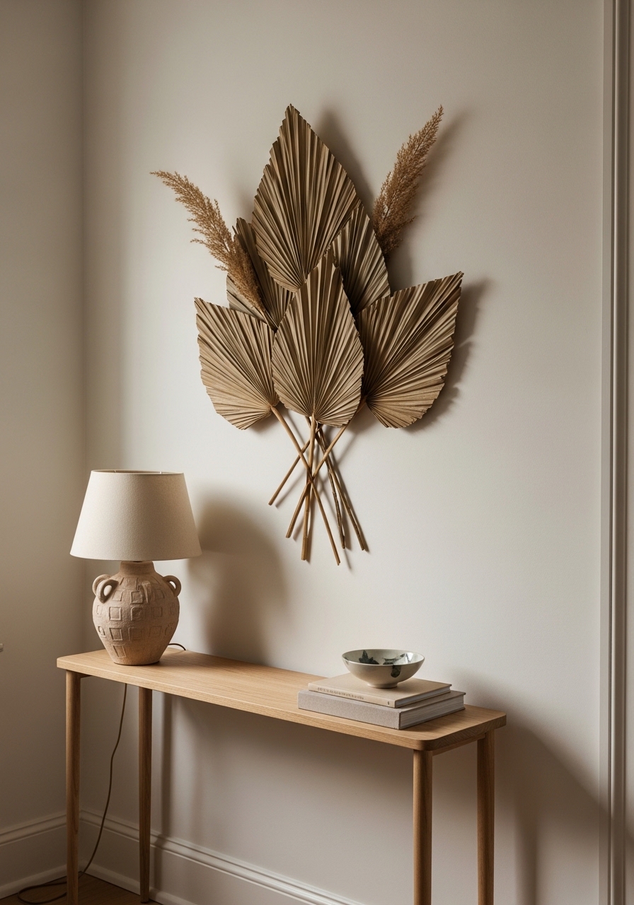 I gathered dried palm stems and mounted them in a staggered cluster. The organic shapes feel edited, not cluttered. Pair with a clay vase on a console and LED Edison bulbs in a table lamp. Mistake: overcrowding — leave negative space around the cluster.