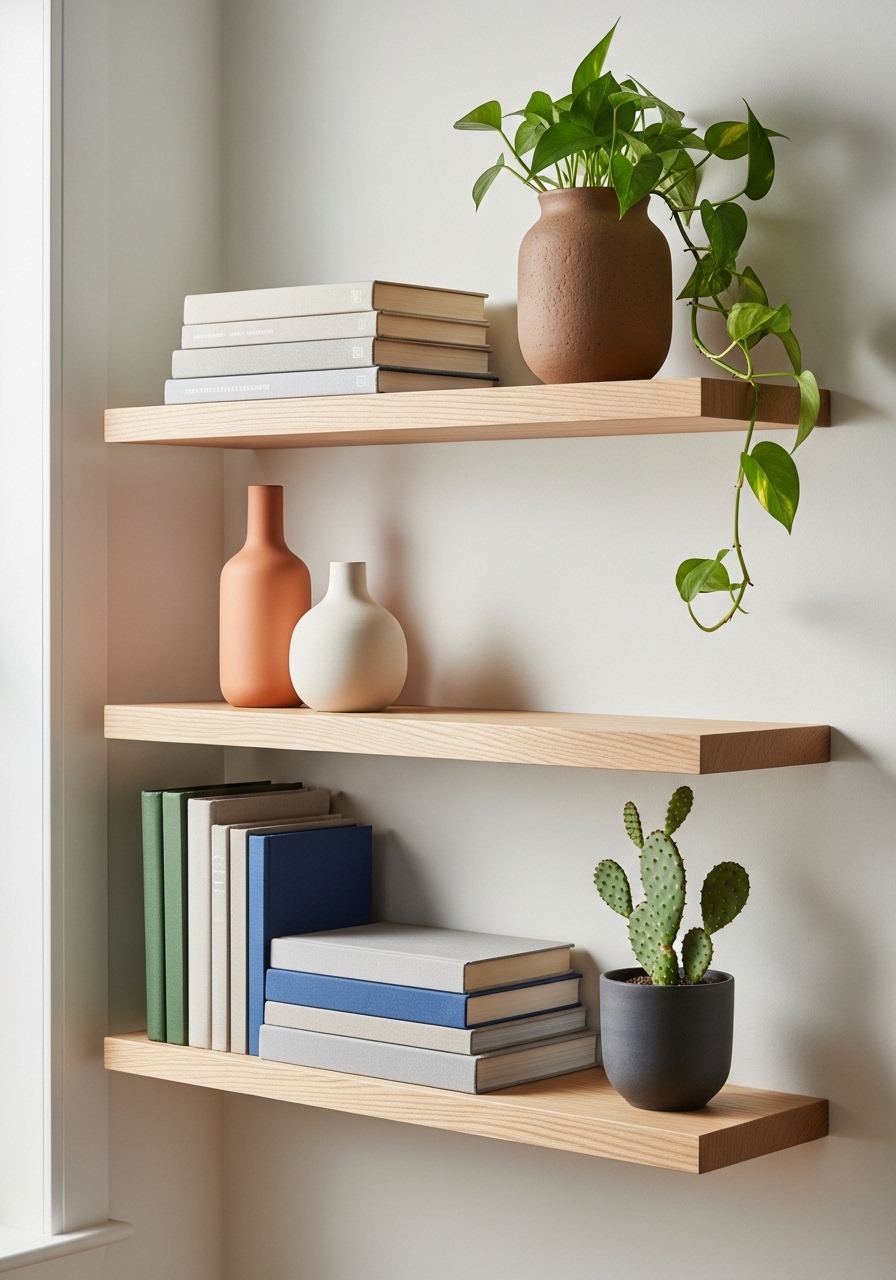 White oak shelves read modern and natural. I styled three shelves using odd numbers: two vases, one stacked book, one plant. Use white oak floating shelves and mix matte ceramic and raw clay. Mistake: symmetry overuse — vary heights for interest.
