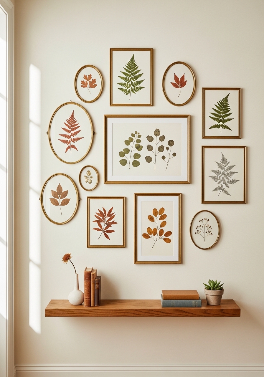 I thrifted brass frames and printed earth-tone botanicals. Using similar mat colors ties mismatched frames together. I used vintage-style brass frames 8×10. Mistake: overfilling — leave breathing room around each piece.