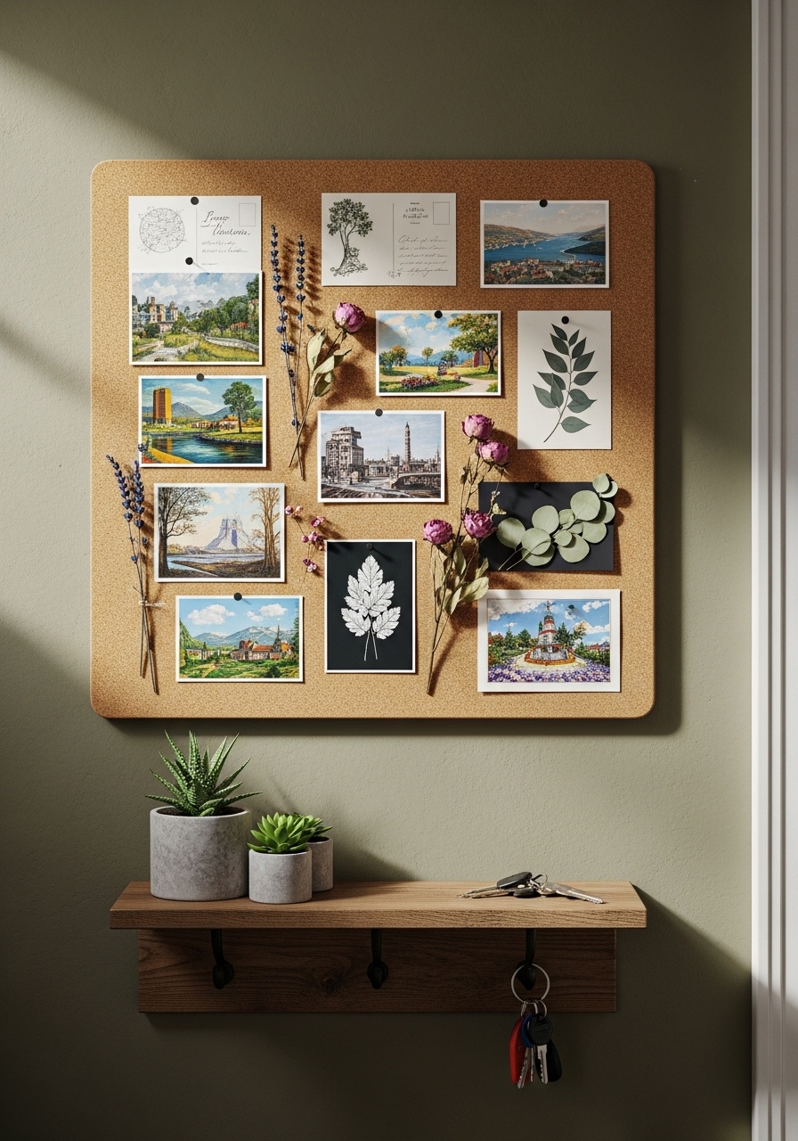 I used cork tiles to create an editable display for notes and dried flowers. It's earthy and useful. Pair with small clay trays on a shelf below. Mistake: covering entire wall — use a contained area for impact.
