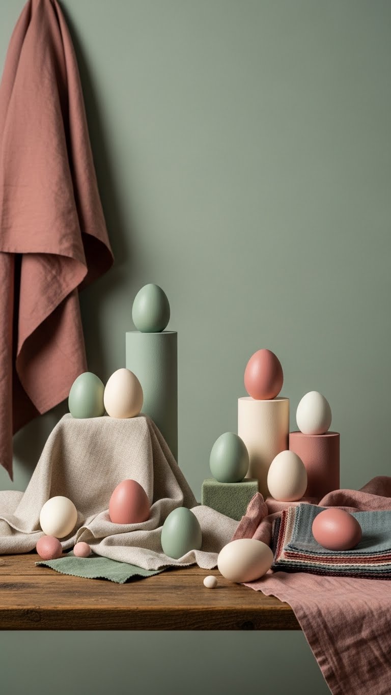 Gather paints in sage or terracotta shades. They’re cheap at dollar stores. Paint eggs or walls with these hues. Start with one color for balance. This takes little effort. Use a brush for smooth application. Create a cheat sheet on paper. List colors and pair them up. Hang it for quick reference. Keep costs under $10. Try this: Dip eggs in dye baths made from food coloring. Let them dry fast. Display on a shelf. Mix with white for a softer feel. This idea works for any room. Make it a quick weekend task. Enjoy the calm vibe it brings.