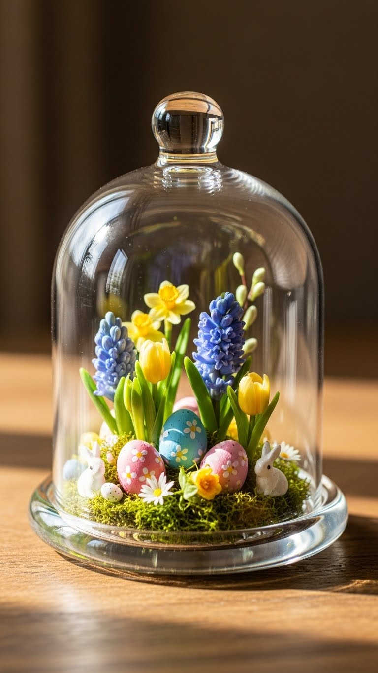Find a glass cloche at flea markets. It might cost $5 or less. Fill it with small eggs or figurines. Arrange them inside neatly. This DIY adds charm instantly. Use what you have at home. Place it on a table or shelf. Secure items with tape if needed. Keep it simple for beginners. Try this: Add fake flowers for color. Cover with the cloche and dust lightly. Set up in minutes. This fits small budgets perfectly. Move it around for different looks. Make it part of your decor rotation. See how it creates a focal point.