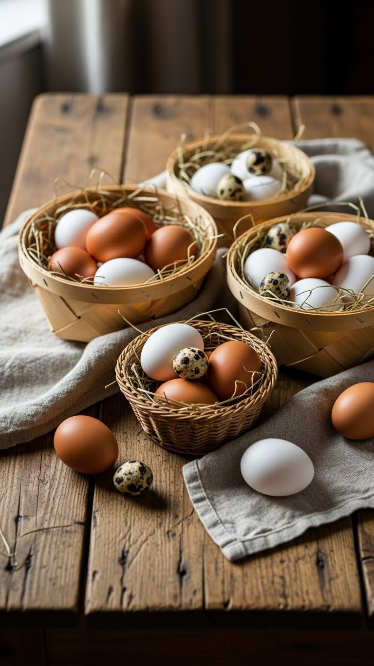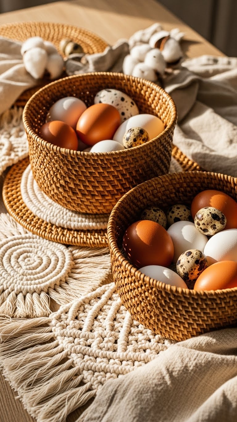 Buy rattan baskets second-hand. Weave in macrame strips if you like. Fill with eggs or treats. This adds texture quickly. Use items you already own. Place on your table for display. Keep costs low. Try this: Wrap baskets with twine for extra pattern. Add flowers inside. Set up for gatherings. This DIY feels bohemian. Reuse for other events. Make it in under 20 minutes.