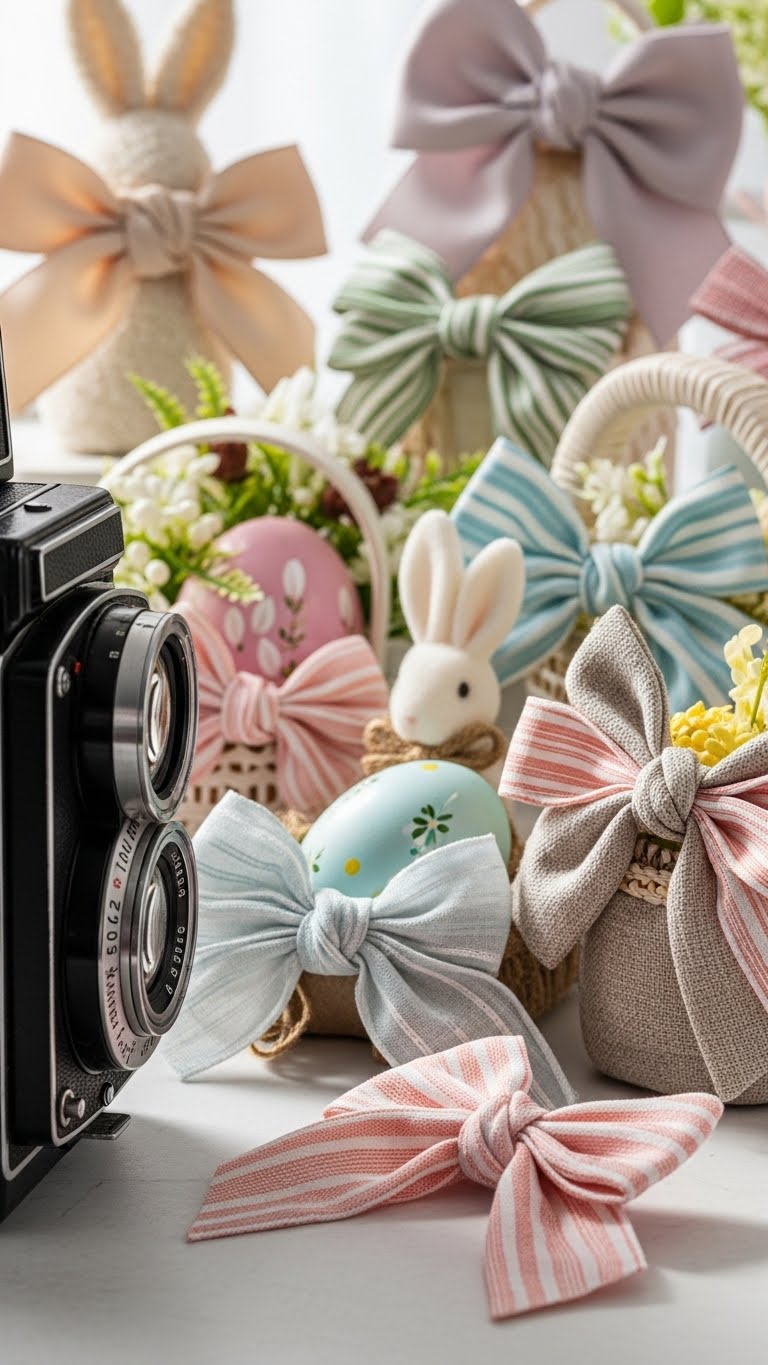 Tie bows on decor. Use ribbon scraps. Add to setups. This pops. Find cheap ribbon. Place everywhere. Try this: Loop and tie fast.