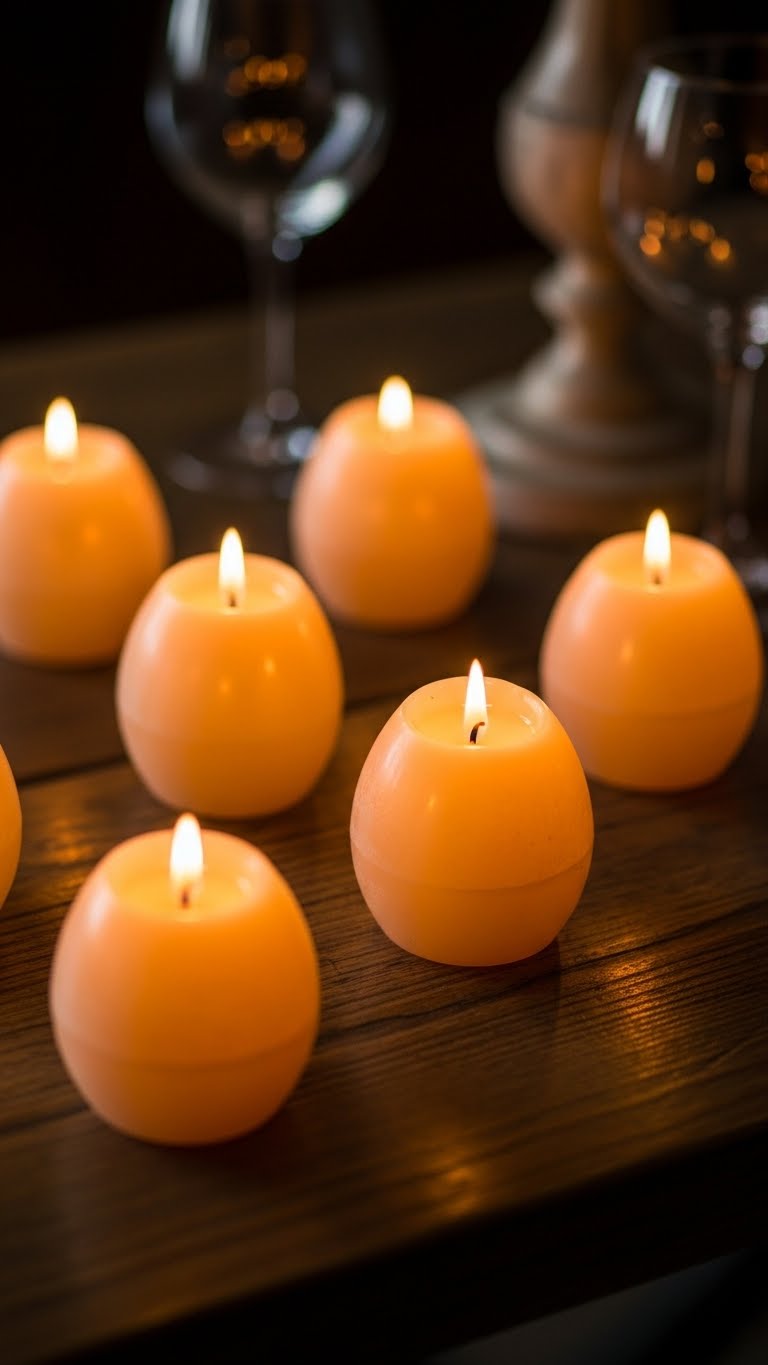 Melt wax into egg molds. Add wicks. Let harden. This glows. Use basic wax. Place on tables. Try this: Decorate simply.