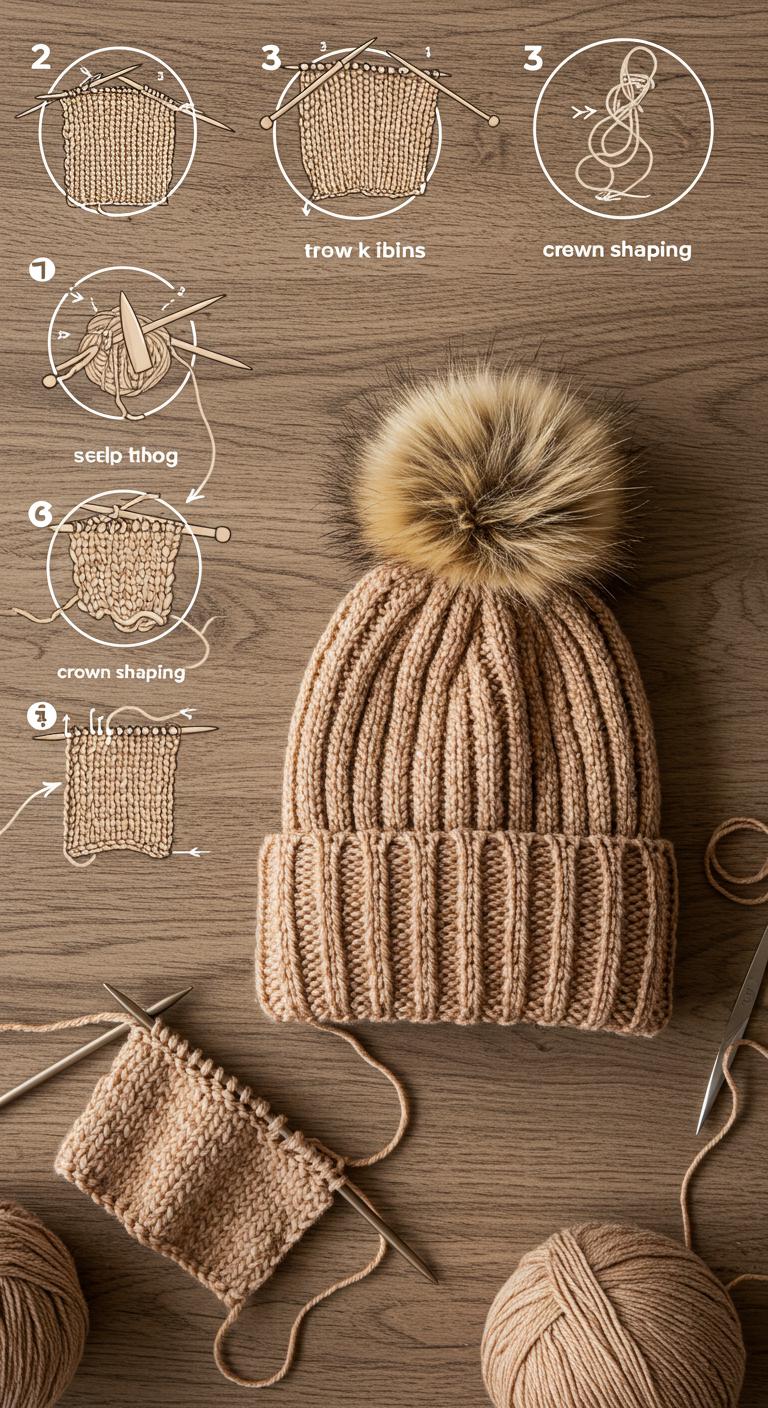Choose beginner yarn choices like worsted acrylic, work comfy ribbing, increase for crown, finish with secure pom pom techniques, and enjoy quick, freeing results.
