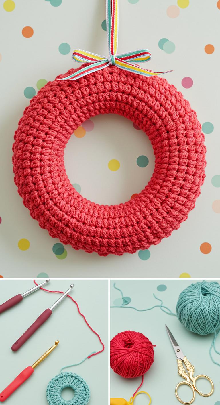 When you want a fast, festive finish, this quick wreath with a ribbon loop comes together in just a few simple rounds—you’ll make a small circular base, add textured stitches for fullness, and finish with a neat loop for hanging.