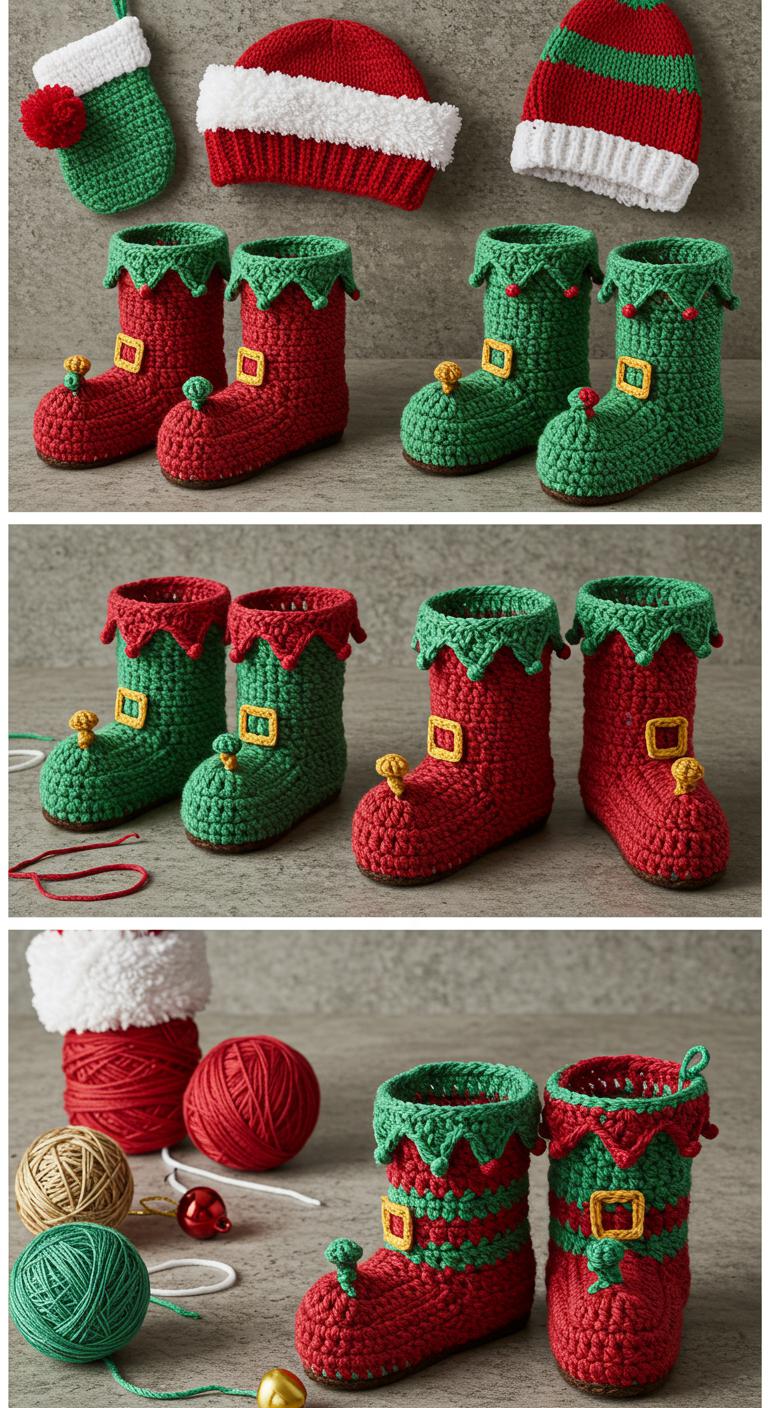 Give your hats and stockings a playful finish with these simple elf boots applique — they’re quick to crochet, picture-perfect for step-by-step photos, and great for practicing small-shape shaping. You’ll follow clear steps: chain, increase, shape toe, seam. Try elf boot variations and festive color combinations. Pin photos as you go, experiment freely, and attach securely for instant holiday charm.