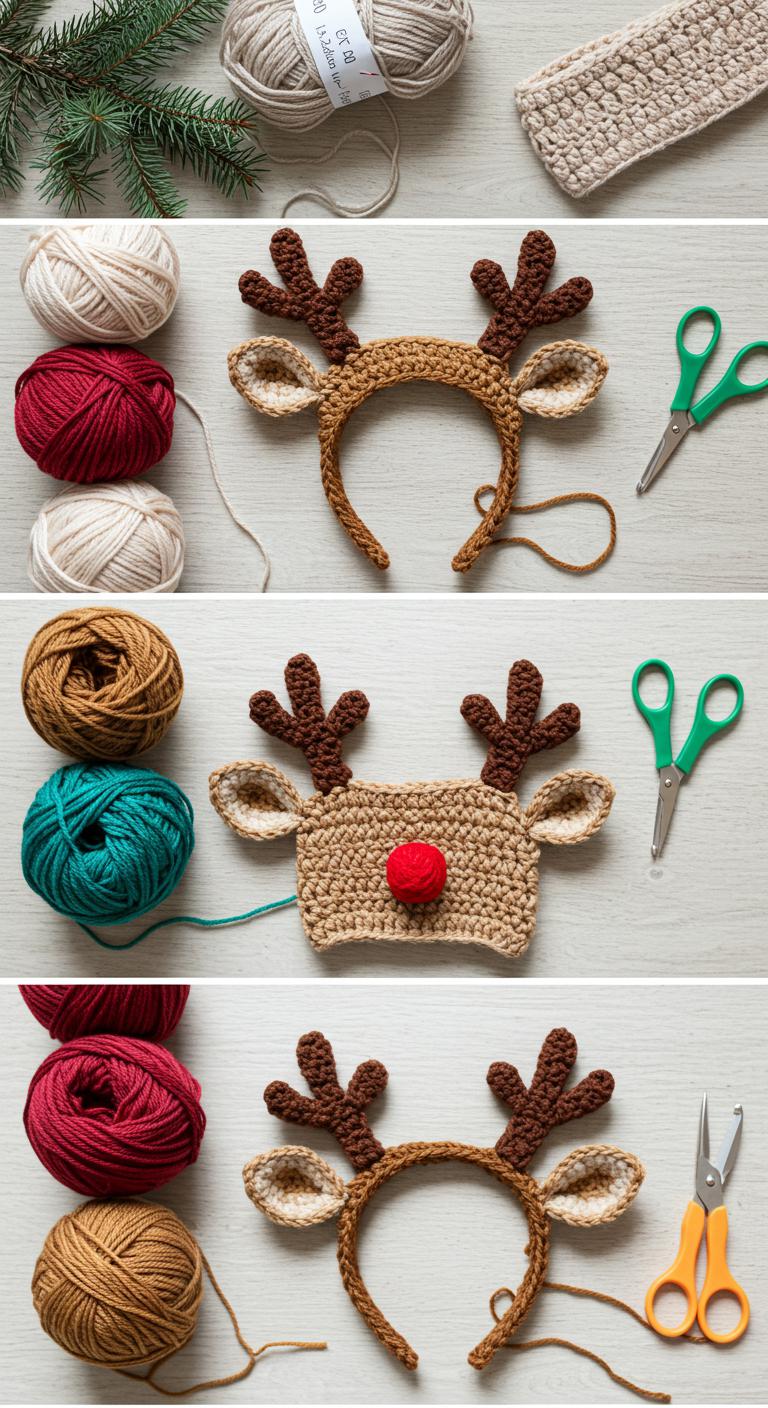 Start by choosing a snug headband base and yarn in warm, reindeer-friendly tones; you’ll crochet a simple band, two antlers, and round ears, then assemble them with visible-photo steps so you can match stitch size and placement exactly.