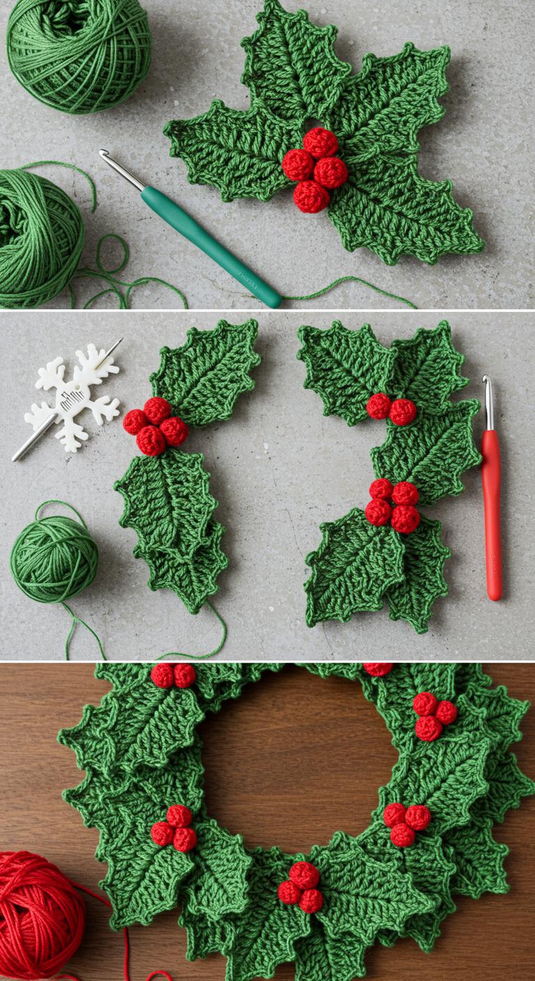 Although it looks intricate, you’ll find the festive holly leaf motif quick to master with a few clear photos and a steady yarn tension; you’ll follow numbered steps: chain, single crochet, increases, and picot edges.