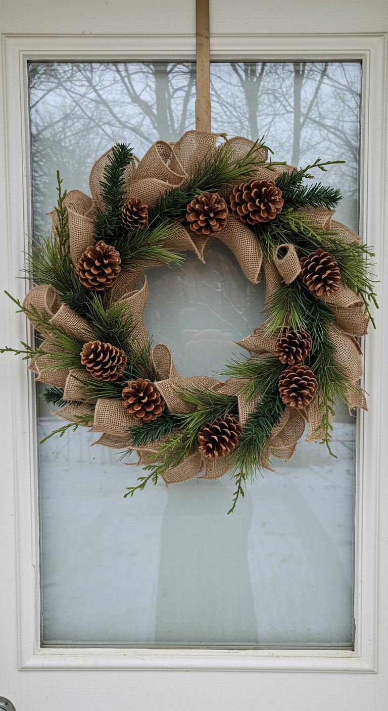 A simple wreath of burlap and pinecones brings rustic elegance to your front door without needing fancy supplies or skills. You’ll wrap a wire frame with burlap ribbon, securing folds every few inches. Add clustered pinecone accents with hot glue, tuck evergreen sprigs and a simple bow. Hang with jute for a natural, freeing look that’s durable in winter weather.