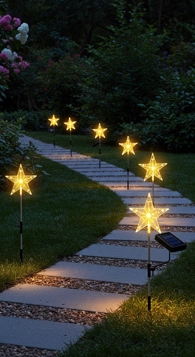 You’ll place stakes at even intervals, angle panels for max sun, and choose warm LEDs to create a cozy solar garden glow.