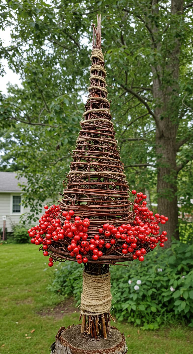 You’ll collect natural materials, bind twigs into a cone, secure faux or preserved berries, and wrap with waterproof twine.
