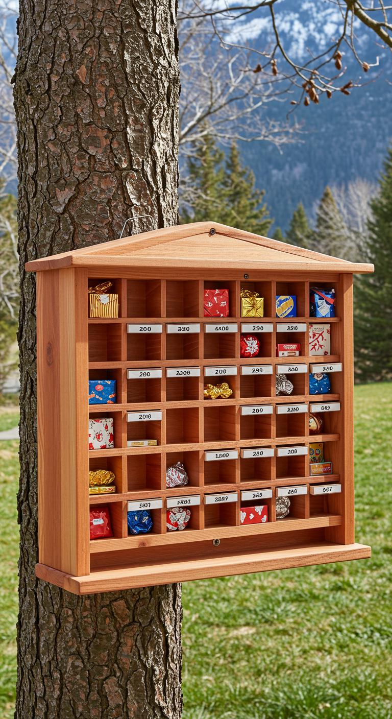 Think of an advent countdown box as a weatherproof focal point that invites daily moments of outdoor delight; you’ll build a sturdy, charming unit that holds 24 small surprises and stands up to wind and moisture. You’ll craft labeled compartments, use cedar or treated pine, apply marine sealant, and mount it securely. These advent box ideas create a public countdown calendar that’s tidy, tactile, and freedom-friendly.