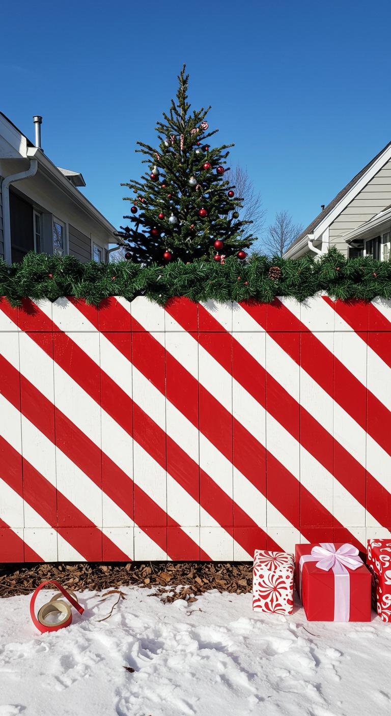 Turn plain picket fence posts into festive candy-striped accents with just paint, painter’s tape, and a steady hand. You’ll measure uniform bands, mask precisely, and alternate bright candy cane colors for crisp contrast. Seal with exterior varnish for durability. This picket fence design keeps lines clean and timeless, letting you express freedom through minimalist, bold holiday detailing without overcrowding your outdoor space.