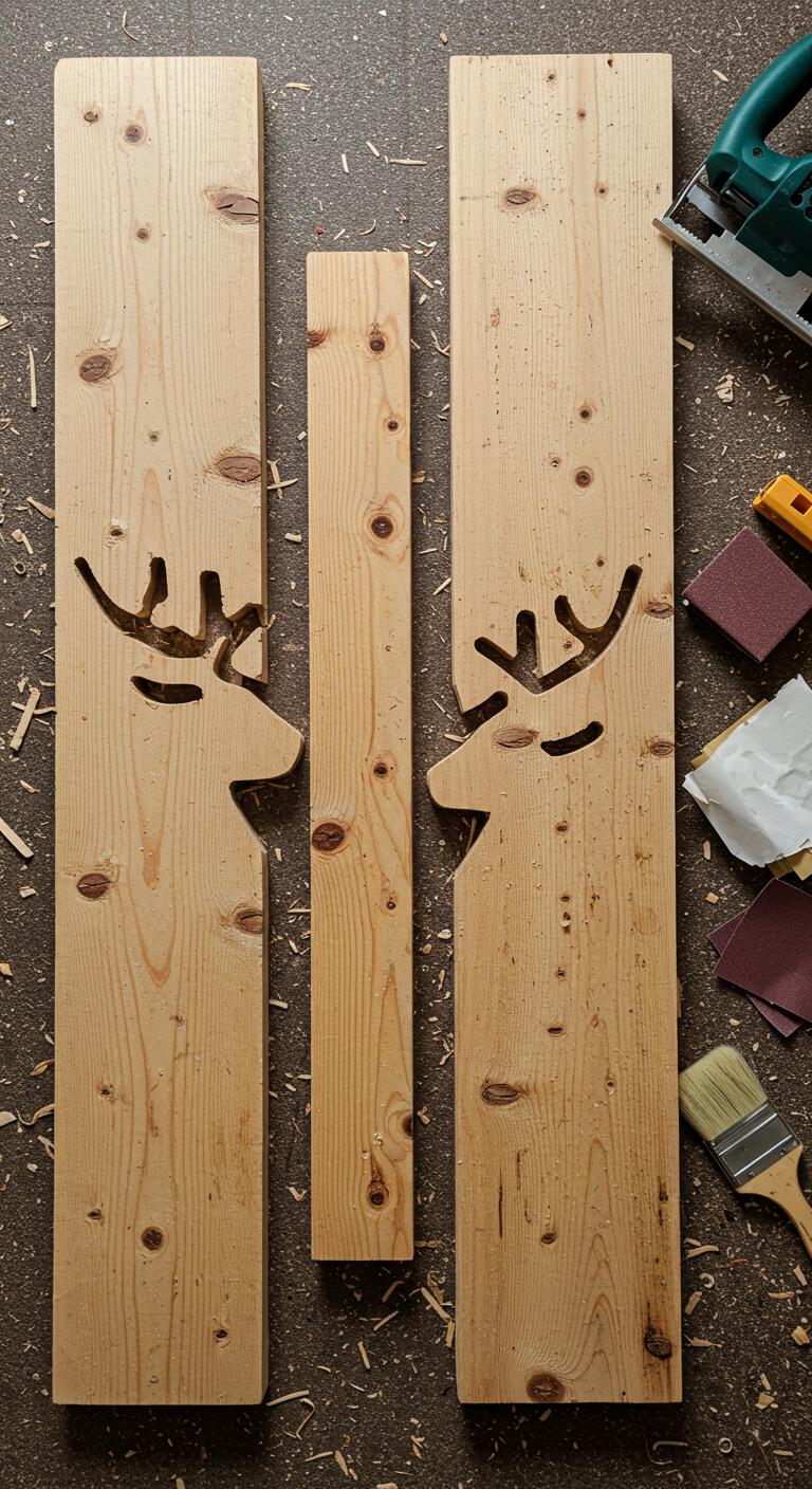 Start by salvaging 2–3 pallet boards that are straight and splinter-free. Then lay them side by side and trim to the height you want your reindeer to stand; you’ll work from a single, continuous silhouette so board alignment and clean edges matter.