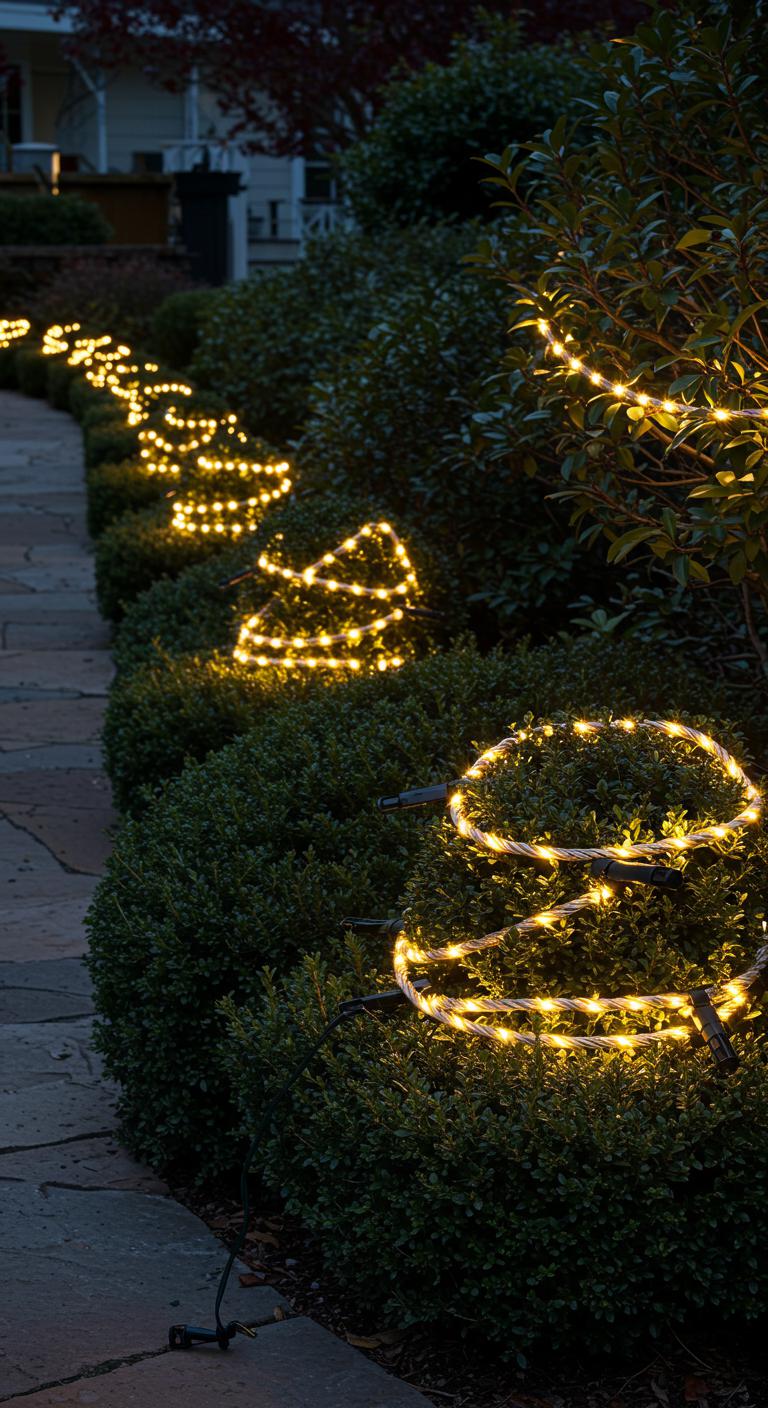 Wrap rope lights snugly around shrubs to create glowing silhouettes that highlight foliage and add nighttime curb appeal.