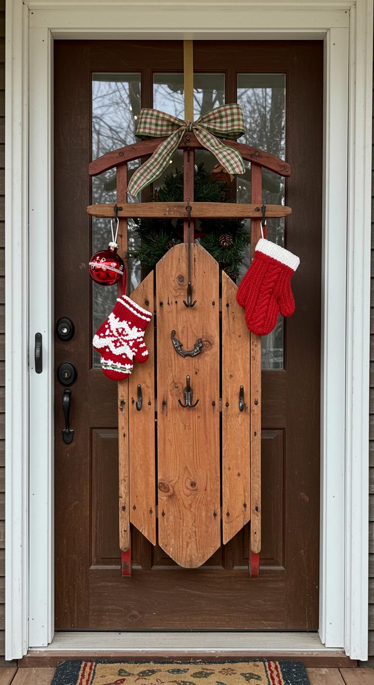One reclaimed wooden sled, a few metal hooks, and some weatherproof ribbon will give your front door a charming, vintage look that’s both sturdy and seasonally festive.