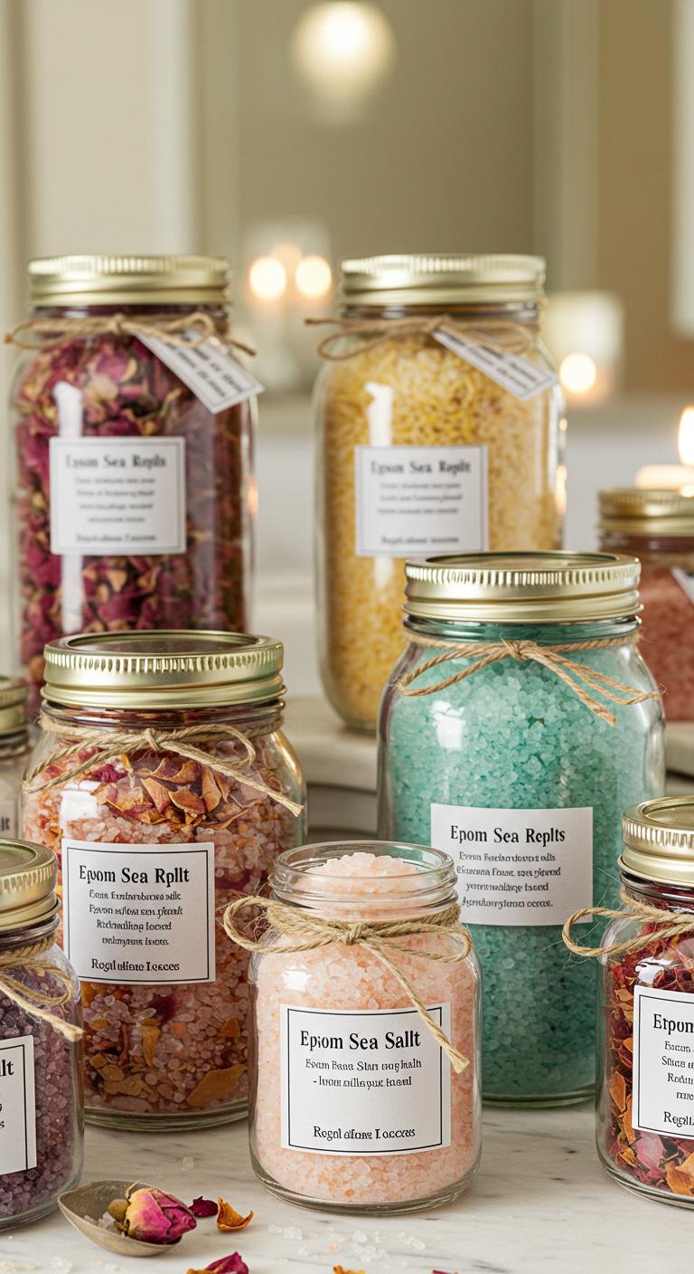 You’ll mix Epsom and sea salts, add dried petals or herbs, then blend a few drops of essential oil for essential oil benefits.