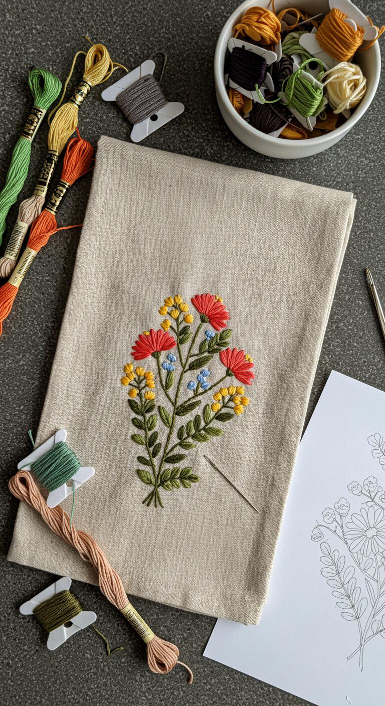 One simple stitch can turn plain linen into a charming, gift-ready tea towel you’ll be proud to give: pick a neutral fabric, trace a crisp botanical or seasonal motif, and use contrasting threads to make the design pop against the weave.