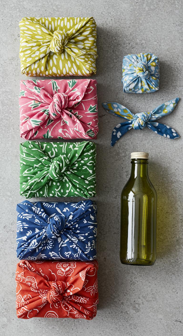 Choose vibrant squares, practice simple furoshiki techniques for boxes and bottles, and knot boldly to showcase texture.