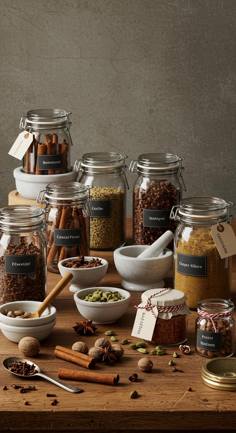 You’ll mix cinnamon, nutmeg, cloves, and cardamom, tasting as you go. Label jars for holiday baking, grind small batches for peak aroma, and choose airtight spice storage.