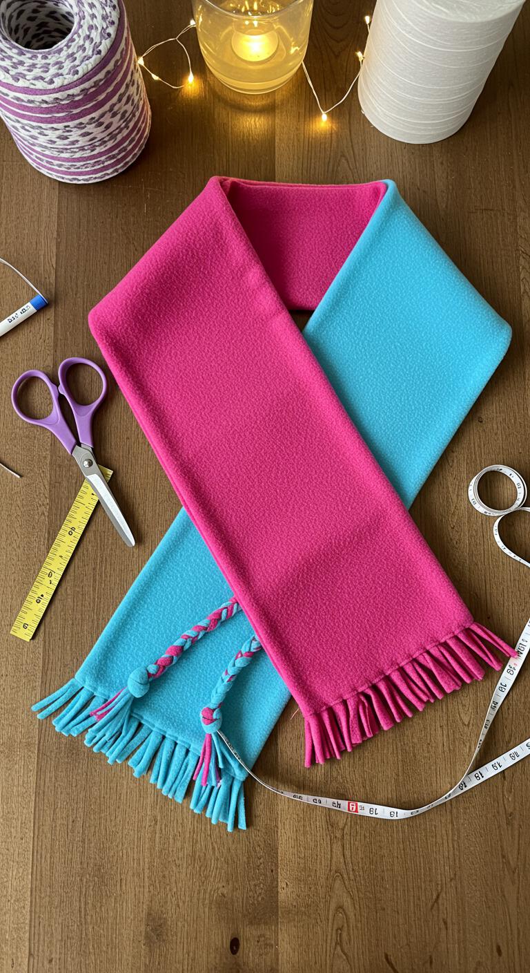 Choose vibrant fleece fabric, cut two rectangles, layer them, and trim fringe along edges. Knot fringe to join ends or add braided accents.