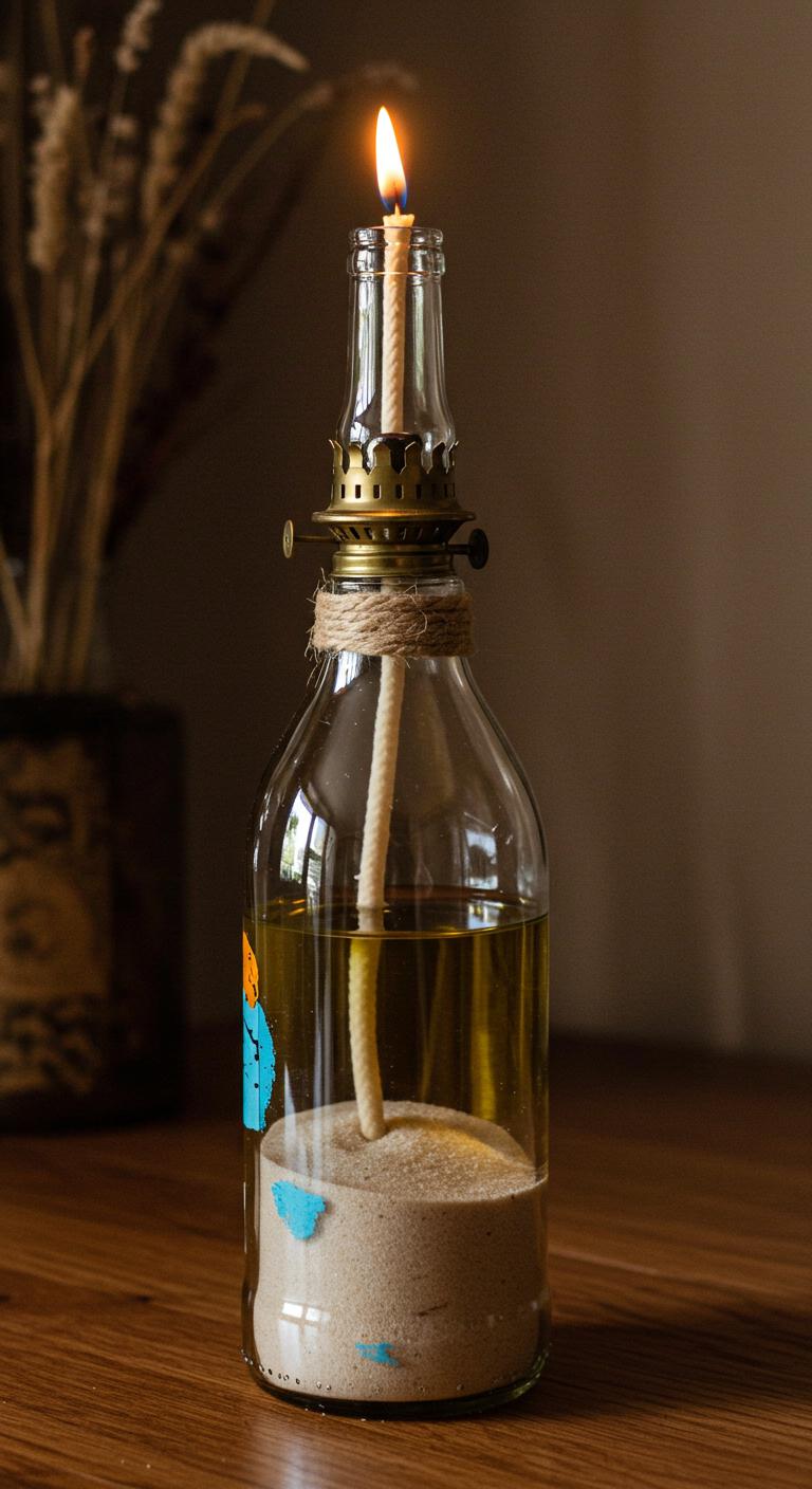 You’ll follow simple upcycling techniques: clean bottle, insert wick-and-tube, pour lamp oil, and secure a metal collar.