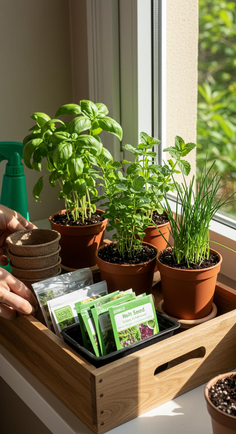 You’ll pick herbs with herb selection tips: basil, mint, chives. Include indoor gardening essentials like drainage trays and a spray bottle.