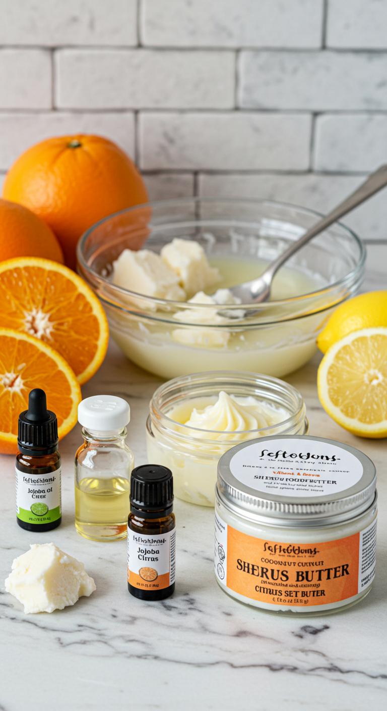 You’ll melt shea and coconut, stir in jojoba, citrus essential oil, and vitamin E.