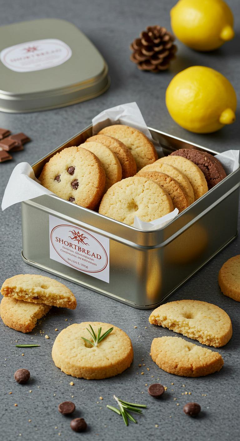 A tin of buttery shortbread makes an instant, charming gift you can whip up in under an hour; you’ll see the pale, crumbly rounds stacked neatly, their golden edges and tiny fork marks promising melt-in-your-mouth bites. You’ll try shortbread variations—lemon zest, chocolate chips, or rosemary—for freedom to customize. Cool completely, nestle in festive packaging, add a simple label, and you’re done.