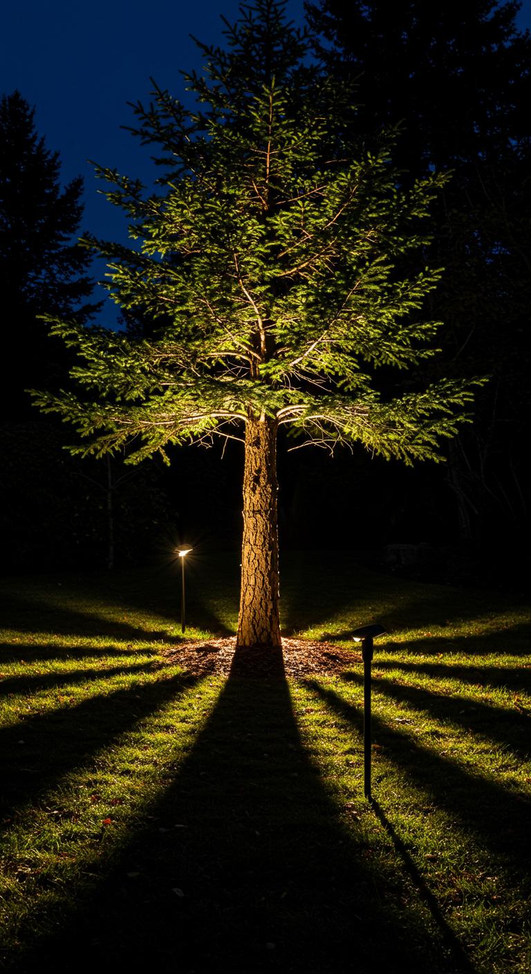 A well-placed spotlight can turn an ordinary evergreen into a sculptural focal point that anchors your yard at night; aim fixtures at the trunk and lower branches to carve out texture and depth while avoiding glare into windows or neighboring properties.