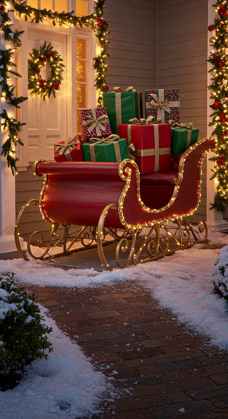 Picture a life-size sleigh parked near your porch—wrapped in waterproof fairy lights and loaded with oversized gift boxes—to create an instant focal point that feels both playful and polished.