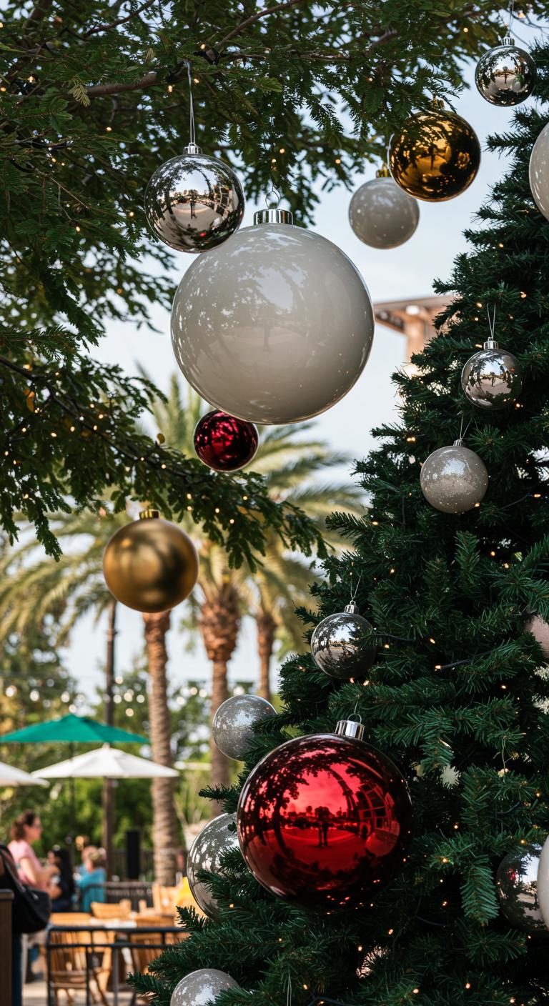 Oversized baubles give trees a sculptural presence, so hang them with attention to branch strength, sightlines, and the way they move in breeze.