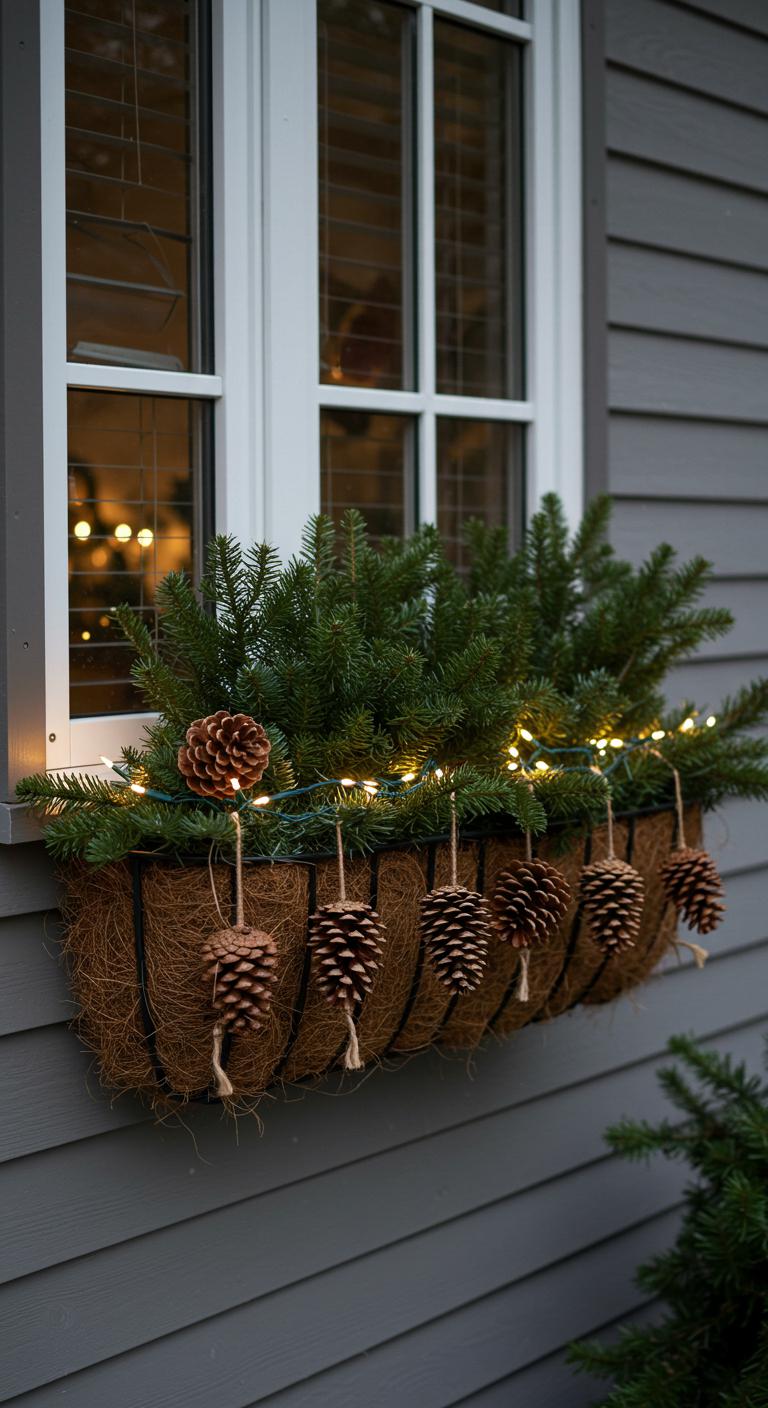 You’ll mix pinecone arrangements with clipped evergreens and a few LED fairy lights, anchoring ends to the box frame.