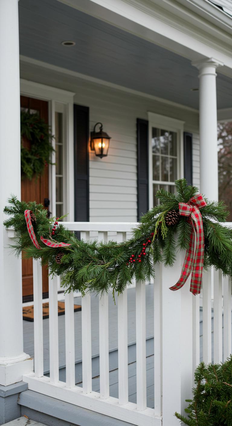 When you wrap lush garland around porch railings, it instantly frames your entry and sets the tone before guests even reach the door.