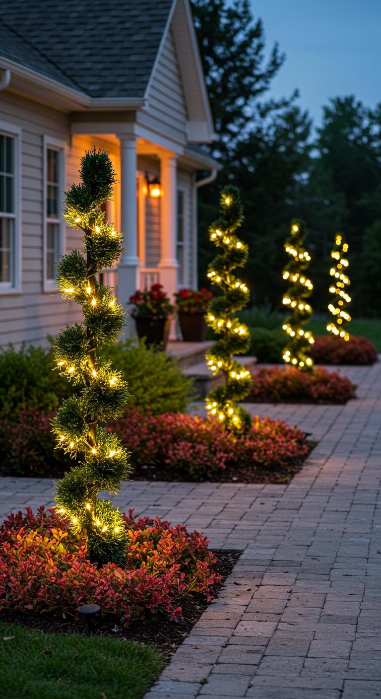 When you line your walkway with lighted topiary spirals, they become a rhythmic guide from curb to door, combining sculptural form with practical illumination.
